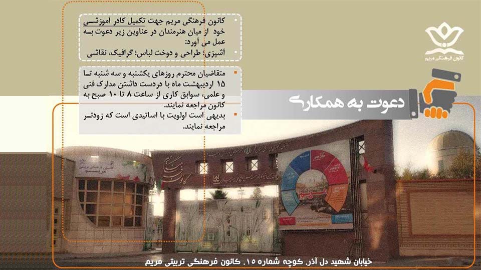 کانون فرهنگی مریم جهت تکمیل کادر آموزشی خود (در تابستان ) از هنرمندان و اساتید در رشته های زیر دعوت به همکاری می کند:
