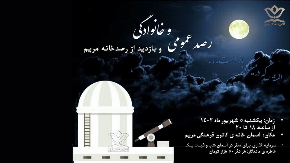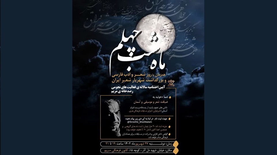 کانون فرهنگی مریم، همزمان با روز شعر و ادب پارسی ویژه برنامه "ماه شب چهلم" آئین اختتامیه سالانه ی فعالیت های رصدی و نجومی آسمانخانه ی مریم را برگزار می نماید.