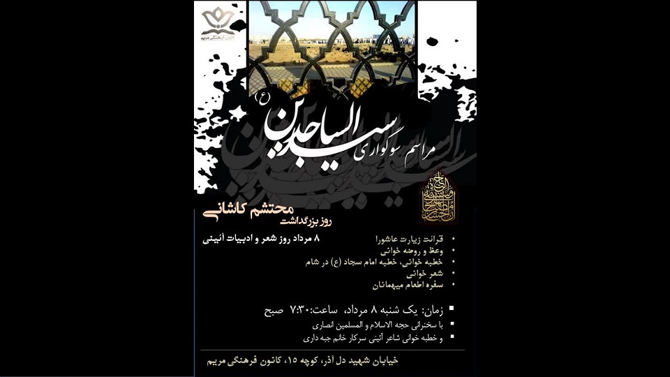 در سالروز شهادت سیدالساجدین حضرت علی بن الحسین زین العابدین علیه السلام، سومین روز شهادت سیدالشهدا علیه السلام و اصحاب باوفایش، ایام اسارت اهل بیت علیهم السلام و همزمان با ۸ مرداد روز شعر و ادبیات آئینی و بزرگداشت محتشم کاشاني برگزار می شود: