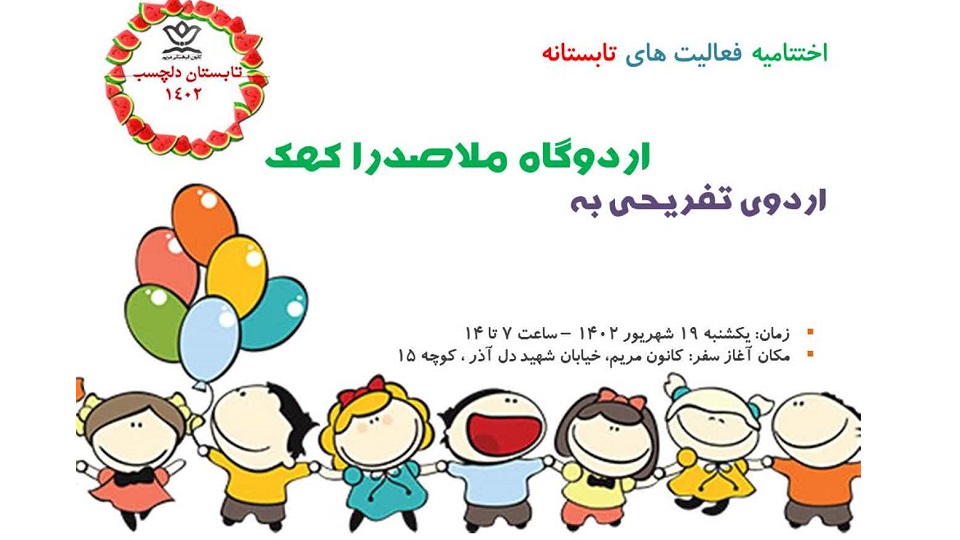 به اطلاع همراهان عزیز می رساند، کانون فرهنگی مریم در نظر دارد اختتامیه ی فعالیت های تابستانه و اردوی تفریحی به اردوگاه ملاصدرا ویژه ی دختران۷ تا ۱۷ سال را به شرح زیر برگزار نماید:
