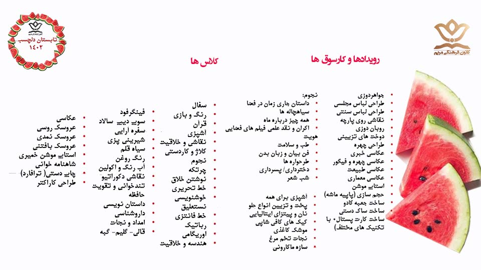 لیست اولیه از رویدادها، کارسوق ها و کلاس هایی که به لطف خدا در تابستان دلچسب 1402 برگزار خواهند شد. گام به گام با ما همراه باشید، و تابستان امسال را متفاوت تجربه کنید.